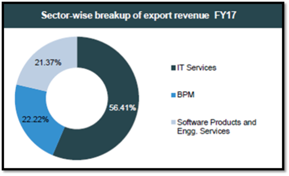 - 회계연도 2016/17 기준 전체 IT산업 수출(하드웨어 제외)의 56.41%가 IT 서비스 부문에서, 22.22%는 BPM 부문에서 창출된 것으로 나타났음.