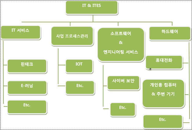 - 인도 IT·ITeS산업은 크게 IT서비스, 비즈니스 성과관리(BPM, Business Process Outsourcing), 소프트웨어 제작 및 엔지니어링 서비스, 하드웨어의 네 가지 영역으로 분류됨.
