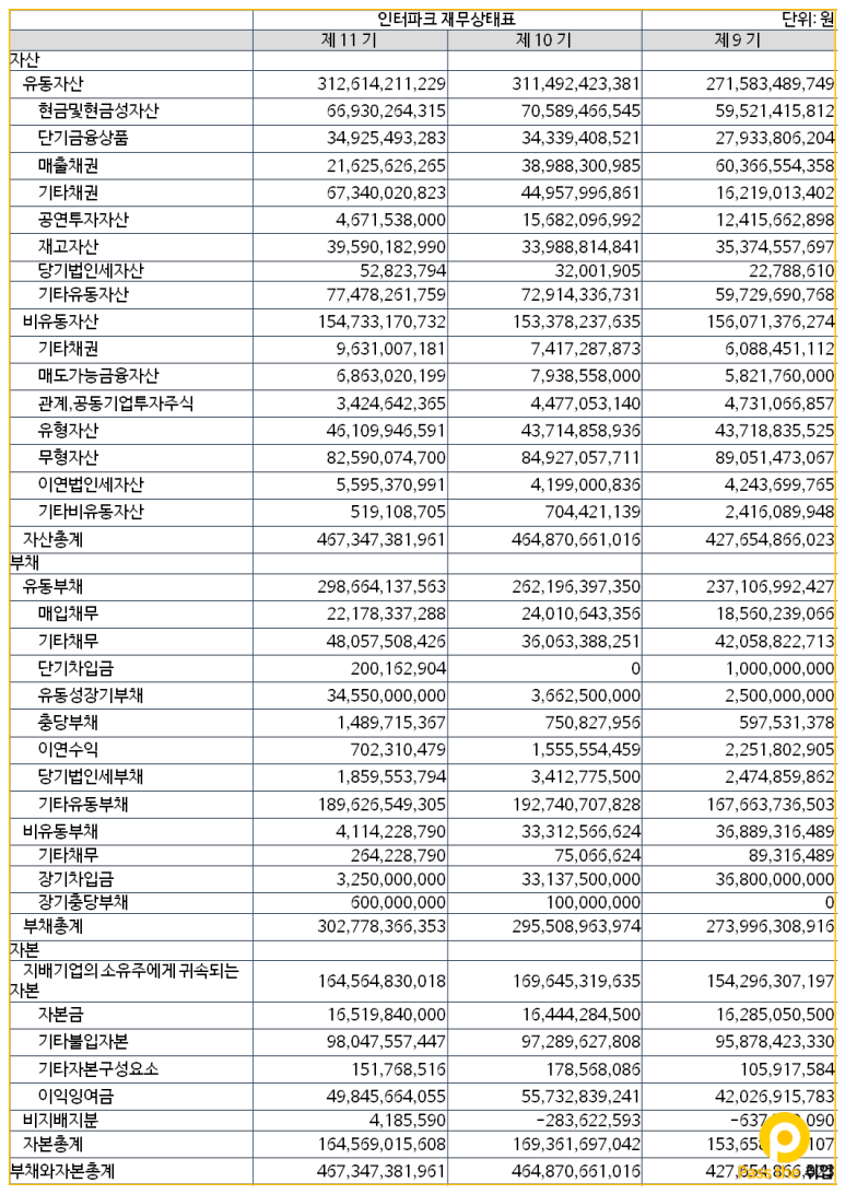 인터파크 재무상태표 (출처: 인터파크 사업보고서)