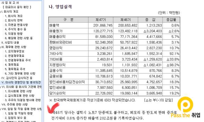 위와 같이 매출과 영업이익 변동 내역 및 변동 사유가 무엇인지에 대한 설명이 간략히 나와있습니다. 보다 자세한 사항은 사업보고서를 참고하시면 됩니다.