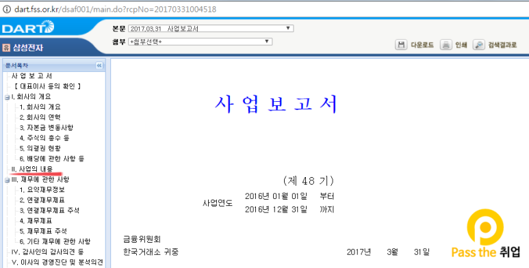 Dart에 접속하셔서 사업보고서, 분기보고서 또는 반기보고서중 필요한 자료를 다운로드하세요. 보고서는 1년에 4번 발행합니다. 발행 시점마다 보고서의 이름이 다른데요. 1분기는 분기보고서. 2분기는 반기보고서. 3분기는 분기보고서. 4분기는 사업보고서라고 합니다. 사업보고서는 1년 치 실적과 경영현황을 보여주는 보고서입니다. 분기보고서와 반기보고서는 분기별 실적과 경영현황을 보여주는 보고서입니다. 아래 경로에 가서 직접 보고서를 검색하고 다운로드 받아보겠습니다. 만약 내가 기업분석을 하는 시점이 2017년 5월일 경우 2016년 사업보고서와 2017년 3월 분기보고서를 준비하시면 됩니다.