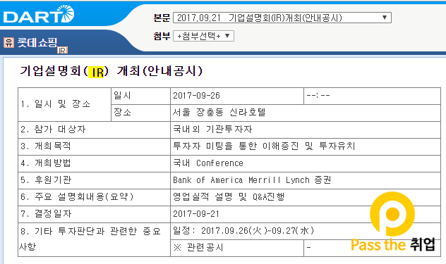 IR과 PR은 다릅니다. IR은 기업이 투자금 유치를 위해 투자자를 대상으로 하는 설명입니다. 홍보는 기업이 언론을 통해 고객을 대상으로 하는 광고입니다. 따라서 기업은 IR을 통해 투자자에게 고객에게는 보여주는 않는 다양한 정보를 제공합니다. 특히 투자 정보는 회사의 기밀사항과도 연결되어 있기 때문에, 때로는 폐쇄적으로 일부 투자자에게만 IR을 열기도 합니다. 결과적으로 홍보는 매출에 영향을 끼칠 상품정보를 제공하는 것이고, IR은 투자자로부터 투자금 유치를 설명을 하는 것입니다. 아래 롯데쇼핑의 기업설명회 공시를 보시면 쉽게 이해가 가능합니다.