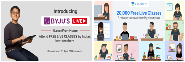 인도의 유명 에듀테크 스타트업도 임시로 무료 강좌를 개설하고 다양한 교육용 앱을 출시하는 등 학생들의 교육권을 보장하기 위해 대안적 방법을 모색하고 있다. 인도의 유니콘 에듀테크 기업인 Byju’s는 3월 11일 자사의 모든 학습 프로그램을 K-12 학급(4-12학급 학생)에게 무료로 제공하기 시작했다. 인도 2위 에듀테크 기업 Unacademy 또한 학생들의 학습권을 보장하기 위해 무료로 2만 개의 라이브 클래스를 제공하고 동시에 시간 및 수업 횟수 제한 없이 온라인으로 수업을 진행할 수 있도록 자사의 플랫폼을 개방했다.