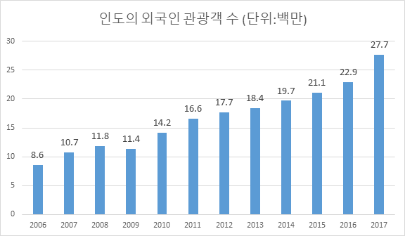 - 인도의 외국인 관광객 수 (FTA)는 2017년 15.6% 증가하여 1017.7만명에 달하였으며