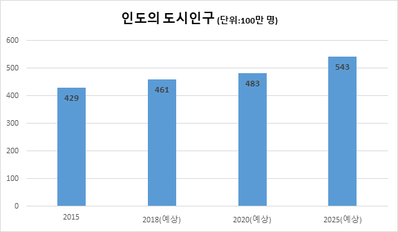 또한 인도정부는 '100개 스마트 도시 프로젝트'를 통해 인도 전역에 100개의 스마트도시를 건설하는 프로젝트를 수행 중이며 이로 인해 인도의 도시인구는 2025년까지 5억 4천 3백만 명에 이를 것으로 예상되고 있다.