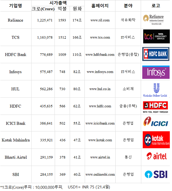 그리고 2021년 1월 시가총액을 기준으로 인도의 양대 증권거래소는 세계 10대 거래소의 위상을 갖게 되었으며 아래의 표에서는 센섹스 및 니프티50에 상장된 시가총액 상위 10개 기업리스트이다.