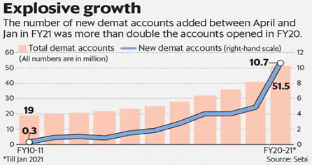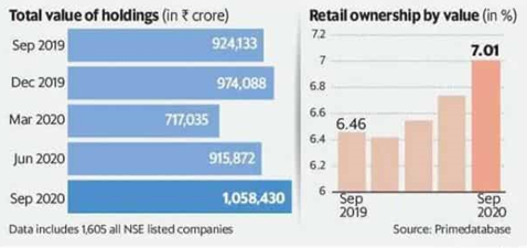 현지 언론에 따르면, 2020년 12월 기준으로 인도 증권시장 전체 참가자는 약 2,800만 명으로 추산되며, 이 중 약 2,700만 명(약 97%)이 개인투자자로 추정된다. 인도 개인투자자의 증권투자액은 전체 증권시장의 투자액 중 7.01%(약 2,060억 달러)를 차지했으며, 이는 2020년 3월 대비 15% 증가한 수치이다.