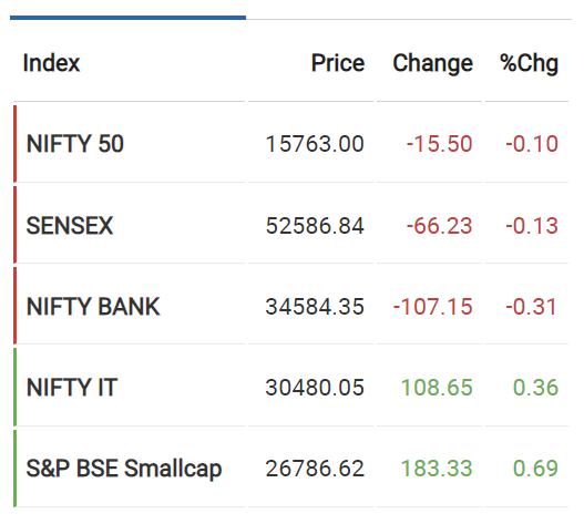 Nifty50는 93.05 포인트(-0.58%) 하락하여 15,763로 마감