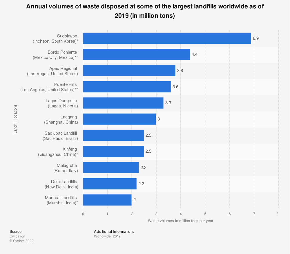 인도 주요 도시인 뉴델리와 뭄바이는 대규모 쓰레기 배출에 골머리를 앓고 있다. 현지 언론에 따르면 뭄바이 인근 18층 높이(36.5m)의 데오나르 매립지는 약 300에이커(약 1.2㎢) 규모로 걸쳐 형성돼 있으며, 쌓인 쓰레기의 양은 1600만 톤 이상으로 추정된다. 또 뉴델리 동쪽 가지푸르에도 거대한 쓰레기 매립지가 자리잡고 있다. 1984년 문을 연 이 매립지는 이미 2002년 수용 능력의 한계치에 도달했고 2019년에는 쓰레기 산의 높이가 65m를 넘어서기도 했다. 인도 과학환경센터(CSE, Center for Science and Environment)에 따르면 인도 전역에 3159개의 쓰레기 산이 존재하며, 그곳에 쌓인 쓰레기의 양은 약 8억 톤으로 추정된다.