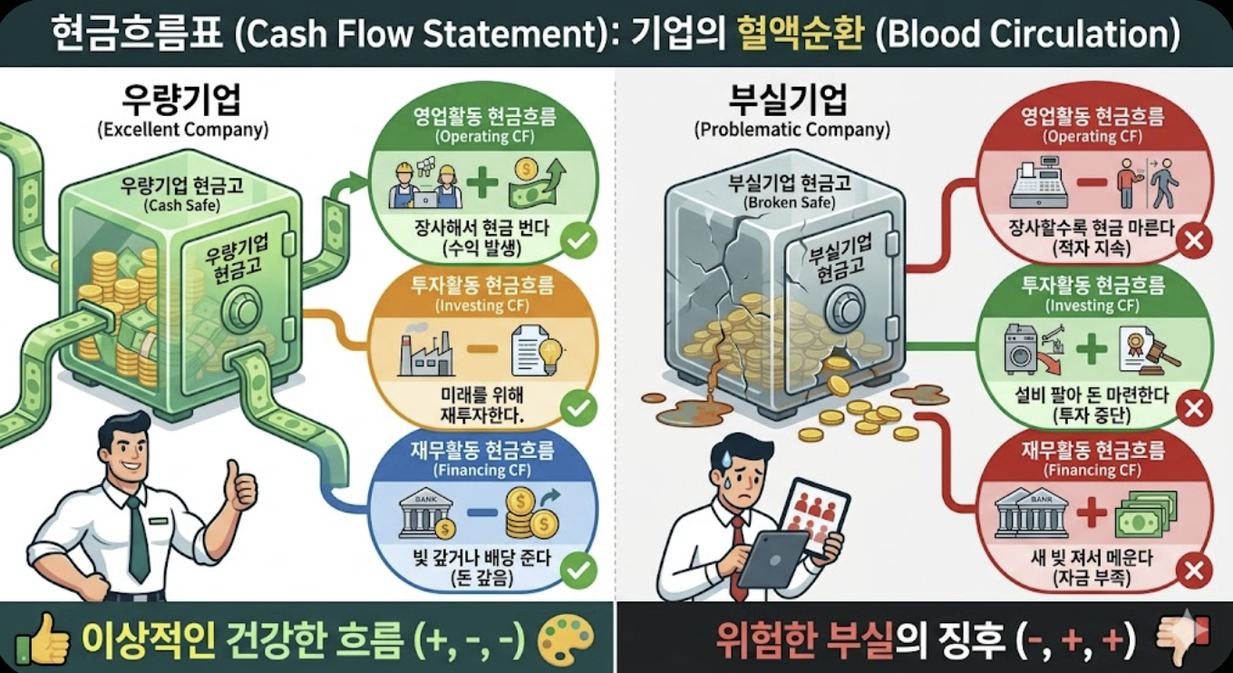 | 현금흐름표 | 혈액순환 | 장부상의 이익 말고, 진짜 '현금'이 돌고 있는가? |